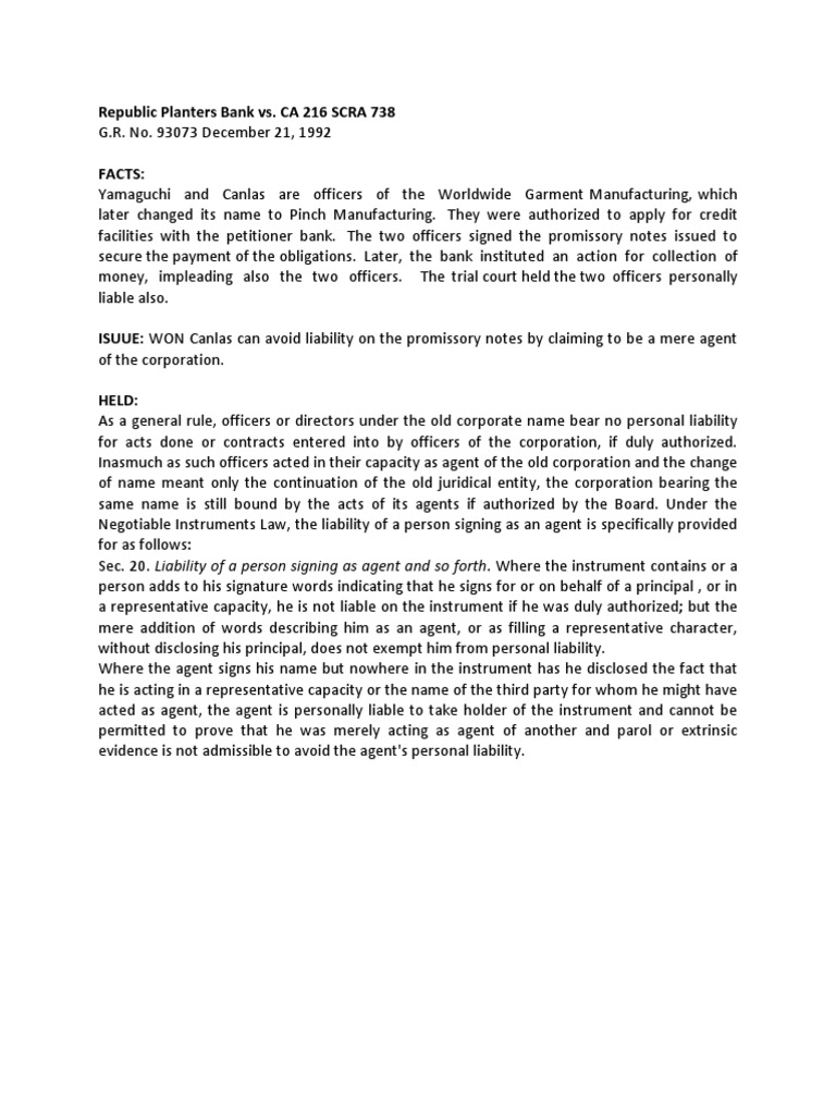 Republic Planters Bank Vs CA PDF Law Of Agency Corporations Republic Planters Bank Vs Ca Case Digest Republic planters bank, petitioner v. — case digest: Court of appeals, gr no. — in 1979, world garment manufacturing, through its board authorized shozo yamaguchi (president) and fermin. republic planters bank v. Court of appeals, and paz l. negotiable instruments case digest: — republic planters bank issued 9 promissory notes signed by shozo yamaguchi (president). Republic Planters Bank Vs Ca Case Digest.